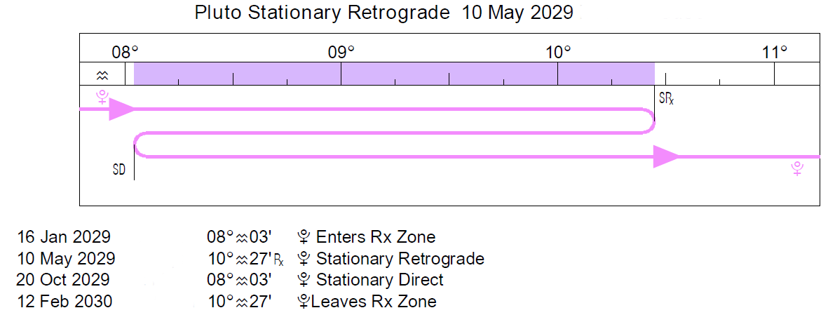 - Pluto stations and turns retrograde on May 10, 2029, at 10° Aquarius 27′ Rx