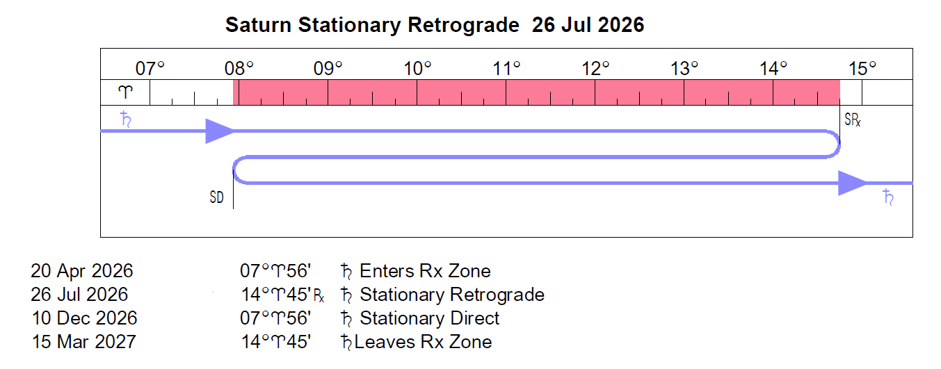 - Saturn stations and turns retrograde on July 26, 2026 at 14° Aries 45′ Rx