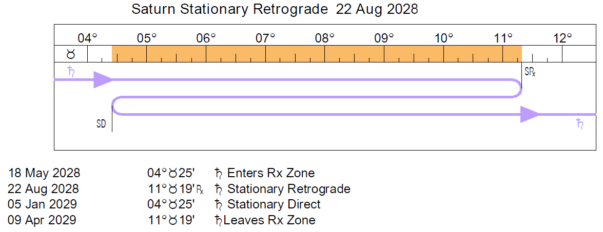 - Saturn enters retrograde zone/shadow on May 18, 2028, at 4° Taurus 25′