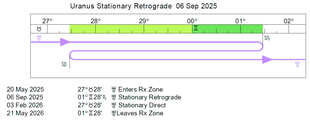 - Uranus stations and turns retrograde on September 6, 2025, at 1° Gemini 28′ Rx