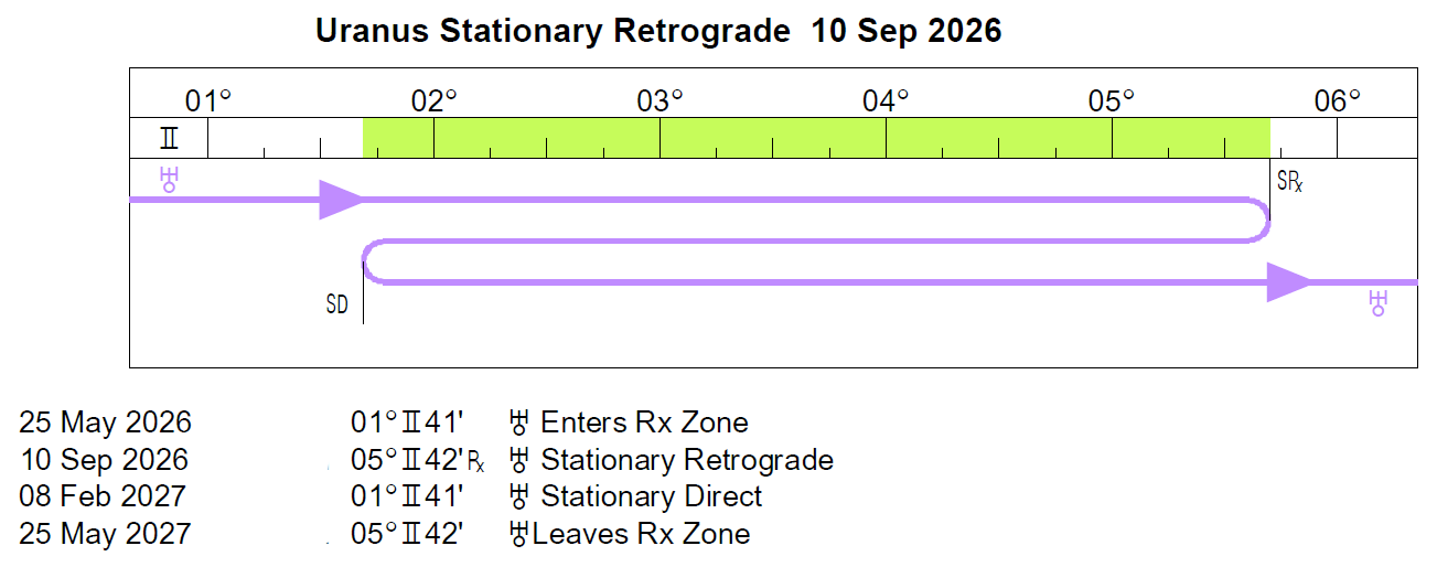 - Uranus stations and turns retrograde on September 10, 2026, at 5° Gemini 42′ Rx