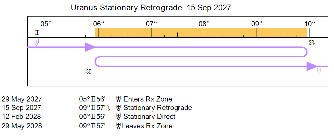 - Uranus leaves retrograde zone/shadow on May 25, 2027, at 5° Gemini 42′