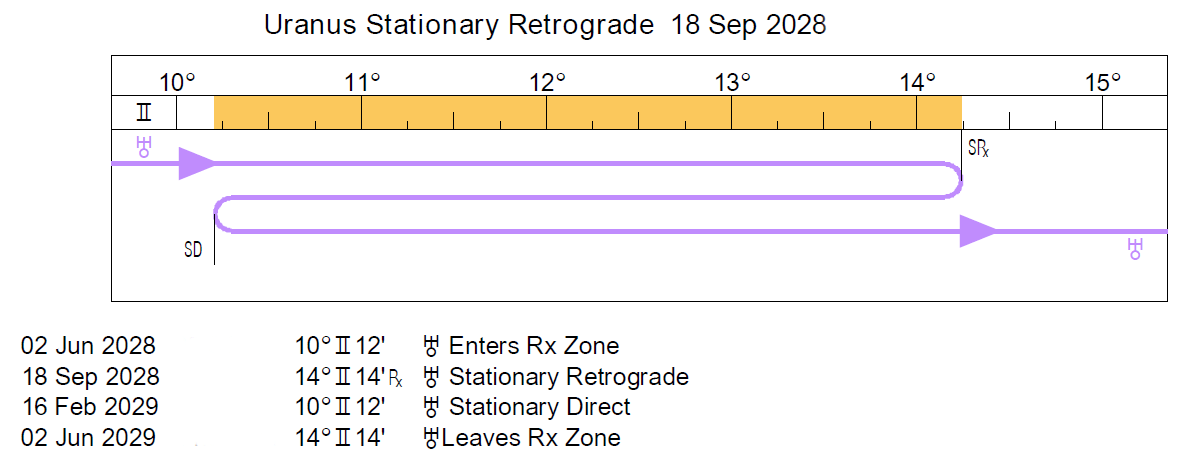 - Uranus enters retrograde zone/shadow on June 2, 2028, at 10° Gemini 12′