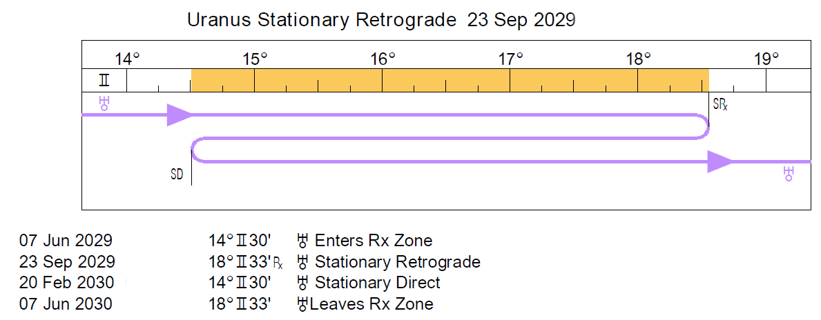 - Uranus stations and turns retrograde on September 23, 2029, at 14° Gemini 14′ Rx