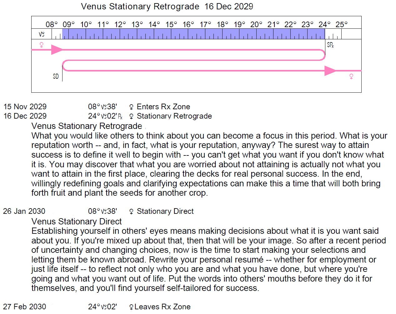 - On December 16, 2029, Venus stations and turns retrograde at 24° Capricorn 02′ Rx