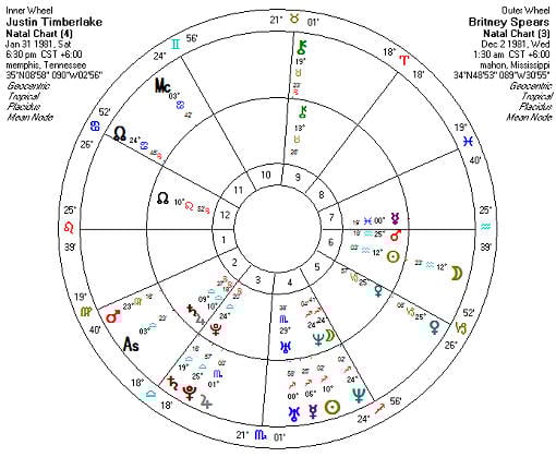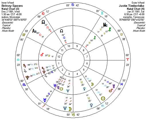 In the above example bi-wheel chart, we have Britney Spears’ natal chart in the center, inner wheel, and we have overlayed Justin Timberlake’s natal chart (his planets and points are found in the outer wheel). This way, we can easily see where Justin’s planets and points fall in Britney’s chart. For example, we see that his Sun conjunct South Node fall in her 5th house, at her Moon. We also see Mars and Mercury overlaying her 5th house (Mercury is very close to her 6th house cusp). His Moon conjunct Neptune overlay her 3rd house. His Saturn falls in her 1st house, near her Ascendant. His Ascendant falls in her 11th house, and so forth.