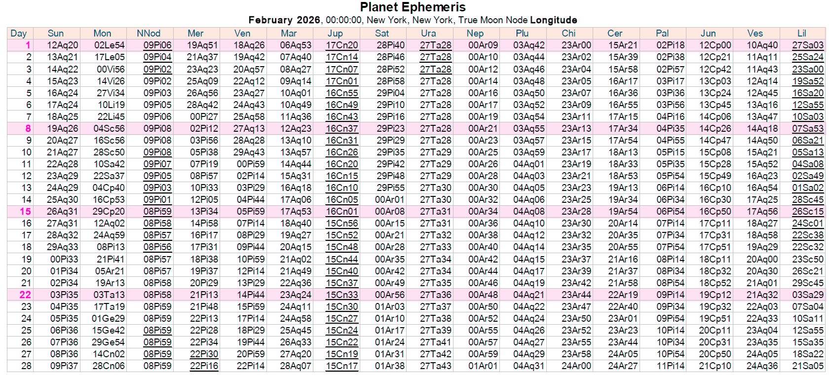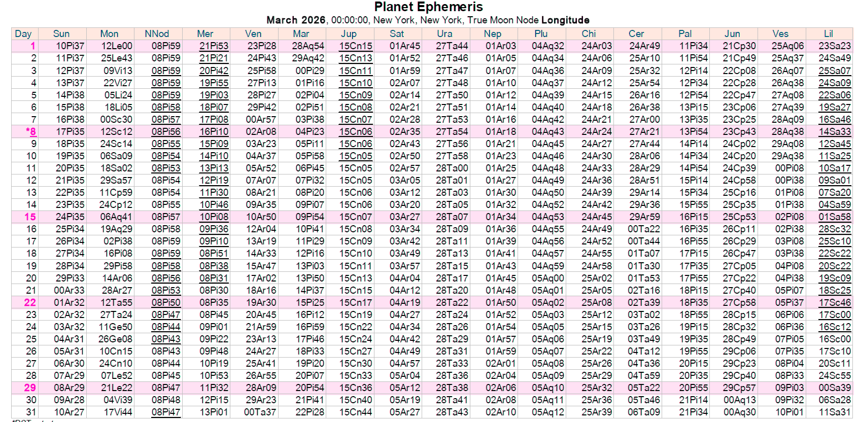 Ephemerides with additional points are for Eastern Time. The North Node and Lilith are the True positions. Retrogrades are underlined. Extra points are Chiron, Ceres, Pallas, Juno, Vesta, and Lilith. These come from the excellent software, Sirius 3.0.