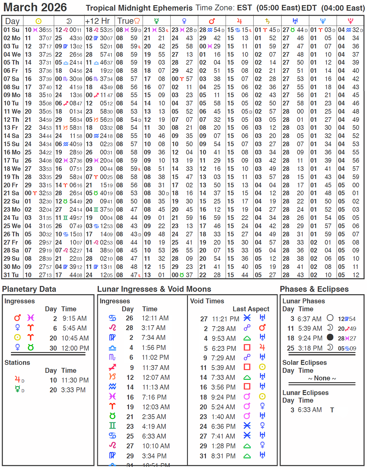 | Mar 30 | 12:01 PM | Venus enters Taurus | Ven 0 Tau 00' |