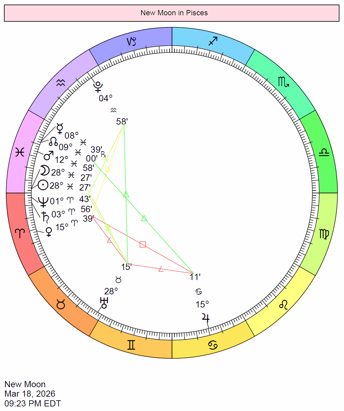 | Mar 18 | 9:23 PM | New Moon in Pisces | 28 Pis 27' |