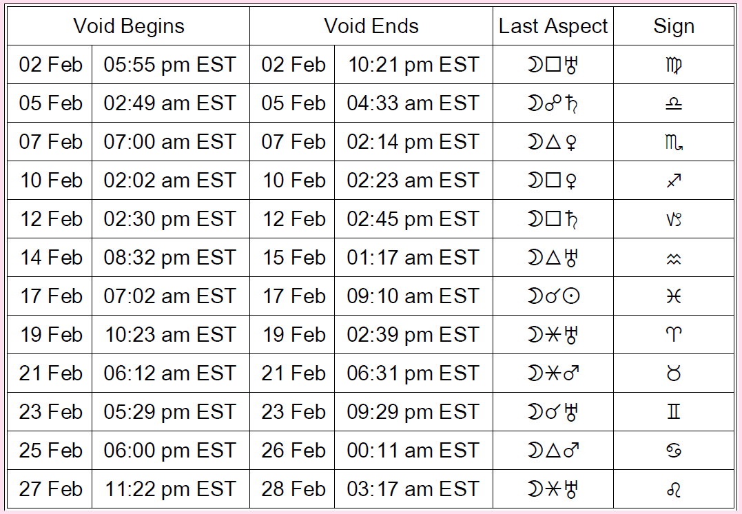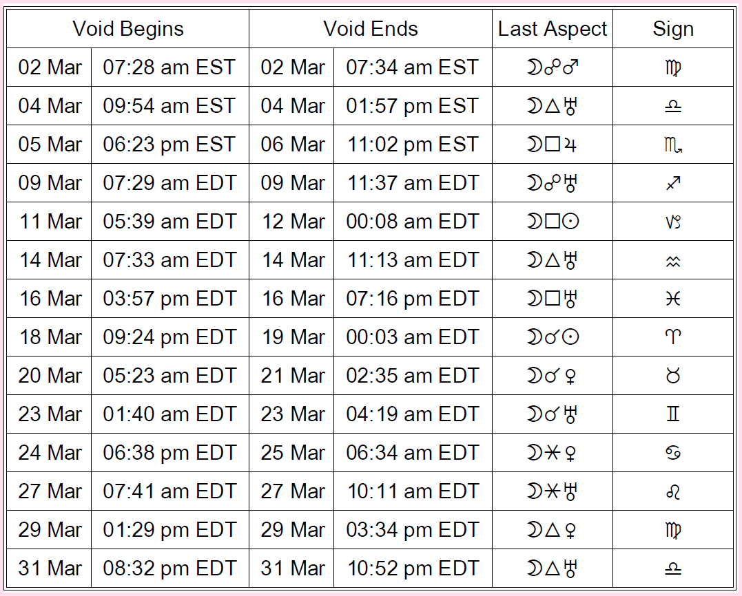 Using the table below: The Moon is Void of Course from the time of its last aspect listed below until the Moon enters a new sign. Generally speaking, these periods are not ideal for launching new endeavors, although they’re not impossible periods, either.