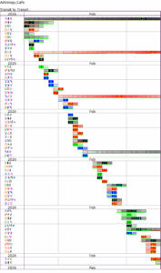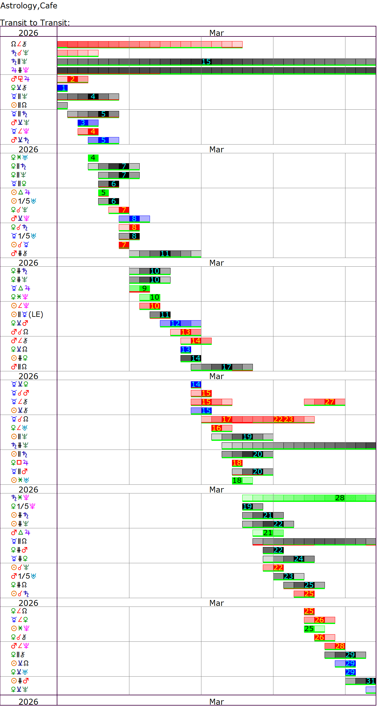 The graph above shows the planets (with the exception of the Moon) in transit for the month of March 2026. For example, the aspect “Mars trine Jupiter” is in influence from March 20-22, with March 21st the date when the aspect is exact (and the influence is strongest).