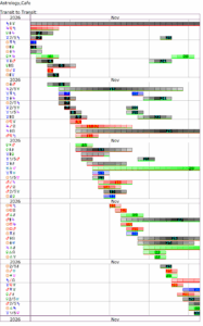 The following are useful for looking at the transits that occur in a year as a whole. The years 2024, 2025, 2026, and 2027 are here: