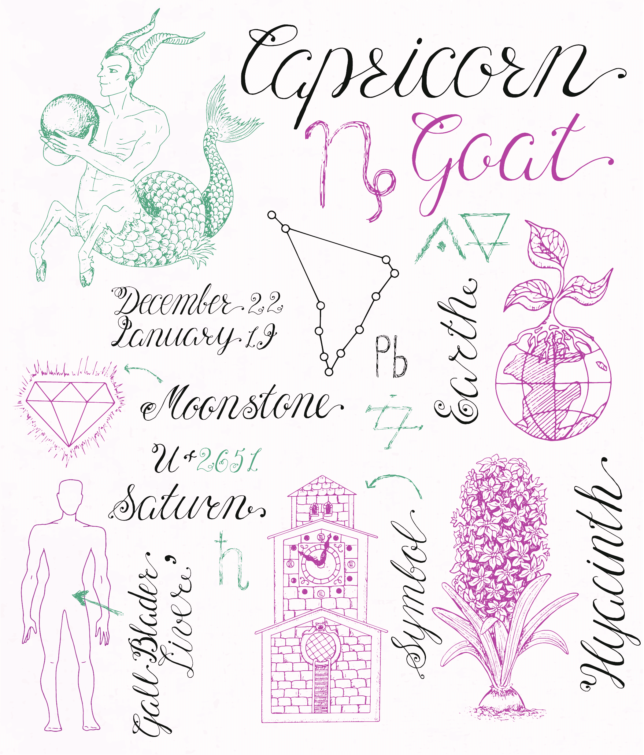 The glyph for Capricorn is a little more intricate than most. The V is thought to depict the goat’s beard; and the tail is that of a fish (Capricorn, in ancient times, was associated with the sea-goat).